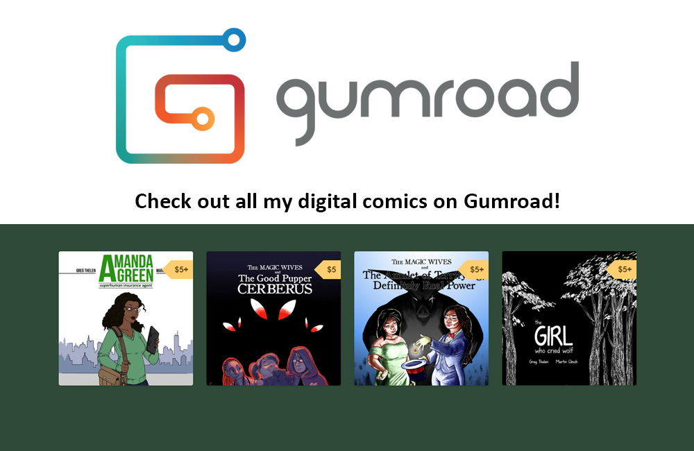 In case you didn’t know, I write a bunch of other comics other than Amanda Green, SIA! Check out my Gumroad page to see all the comics I have to offer! You can still check out my Big Cartel page for some physical AGSIA goodies, too (see below).